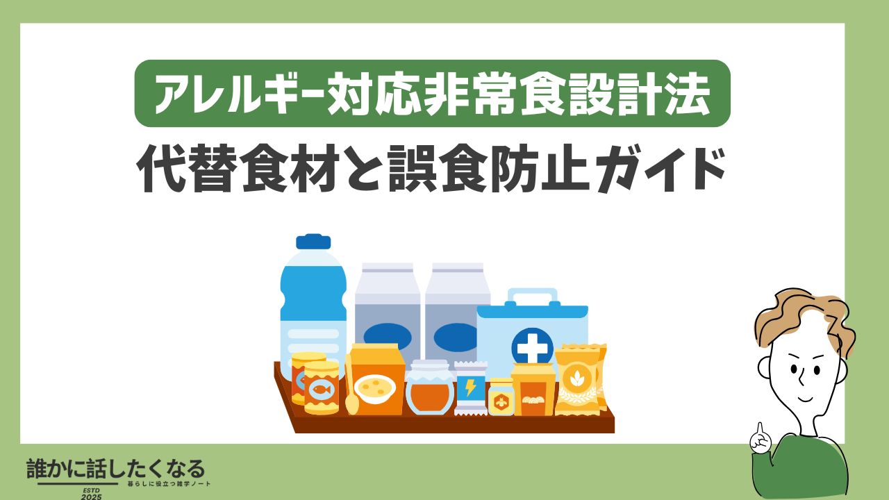 災害時は原材料の確認・調理環境・配給の標示が不十分になりがちです。アレルギーがある家庭は、発災前から**(1)非含有食品の固定化**、(2)代替食材の置換表、(3)誤食防止の色分け運用を整えることで、誤食・栄養不足・交差接触のリスクを大幅に減らせます。本ガイドは家族会議でそのまま使える在庫表・置換表・運用ルールとして作成し、避難所での受け取り手順・携行キット・記録テンプレまで一体で運用できるよう設計しました。