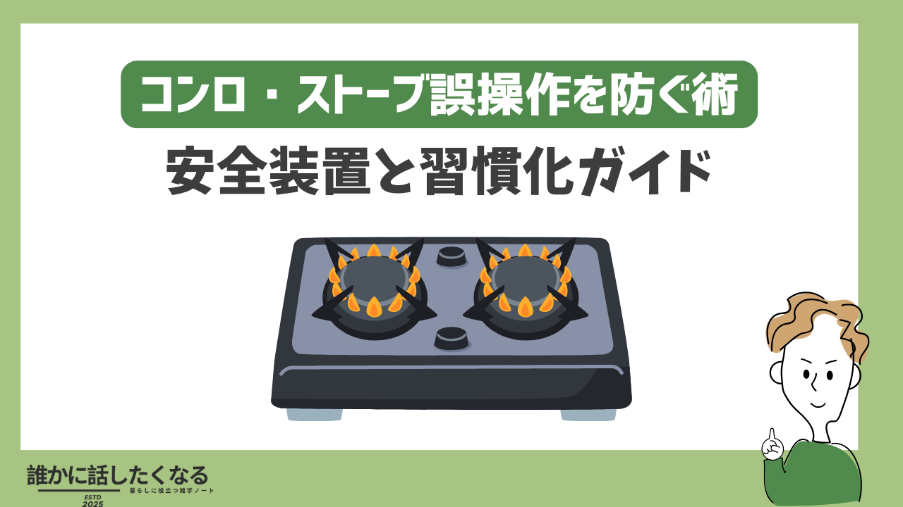 誤操作は、子や来客がツマミに触れる、炎や加熱状態が見えにくい、消火の合図がないことで発生します。対策は物理的に触れにくくする、状態を見える化する、“止める”を仕組みにするの三原則です。ここに**“音・光・手触り”の三感覚**を重ねると、さらにミスが減ります。