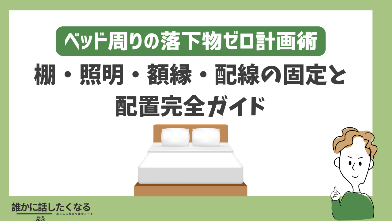 眠っている間こそ最大の無防備時間。 ベッド周りの棚・照明・額縁・小物を見直し、地震・振動・不注意でも落ちない配置と固定を作る実践ガイドです。賃貸・持ち家を問わず、穴あけ不要の方法から確実な下地固定まで、寸法・工具・手順を具体化。最後に月次点検チェック表とQ&A・用語辞典も付け、今日からそのまま導入できます。