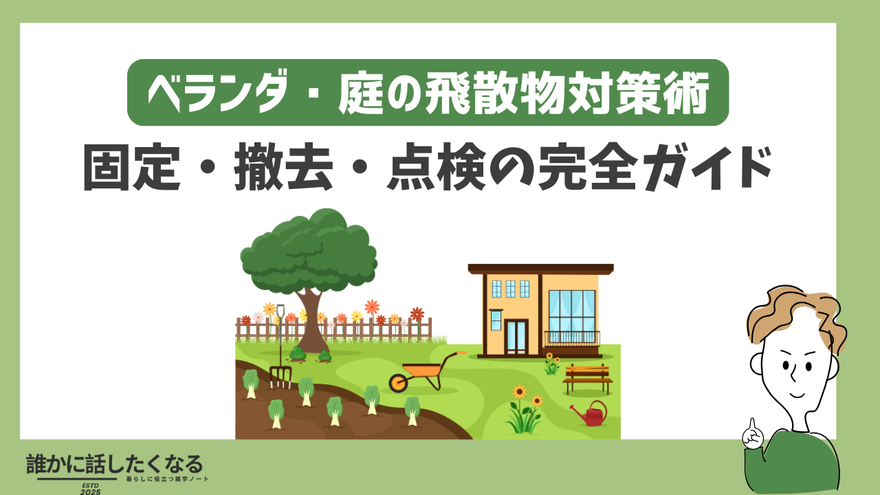 本ガイドは、平時の整理から直前の固定・撤去、通過中の安全運用、通過後の点検・復旧まで、住まいの外周を“飛ばない空間”にする実務手順を徹底的に解説。家族・管理組合・賃貸でもそのまま使える表・チェックリスト・声かけテンプレ付きです。