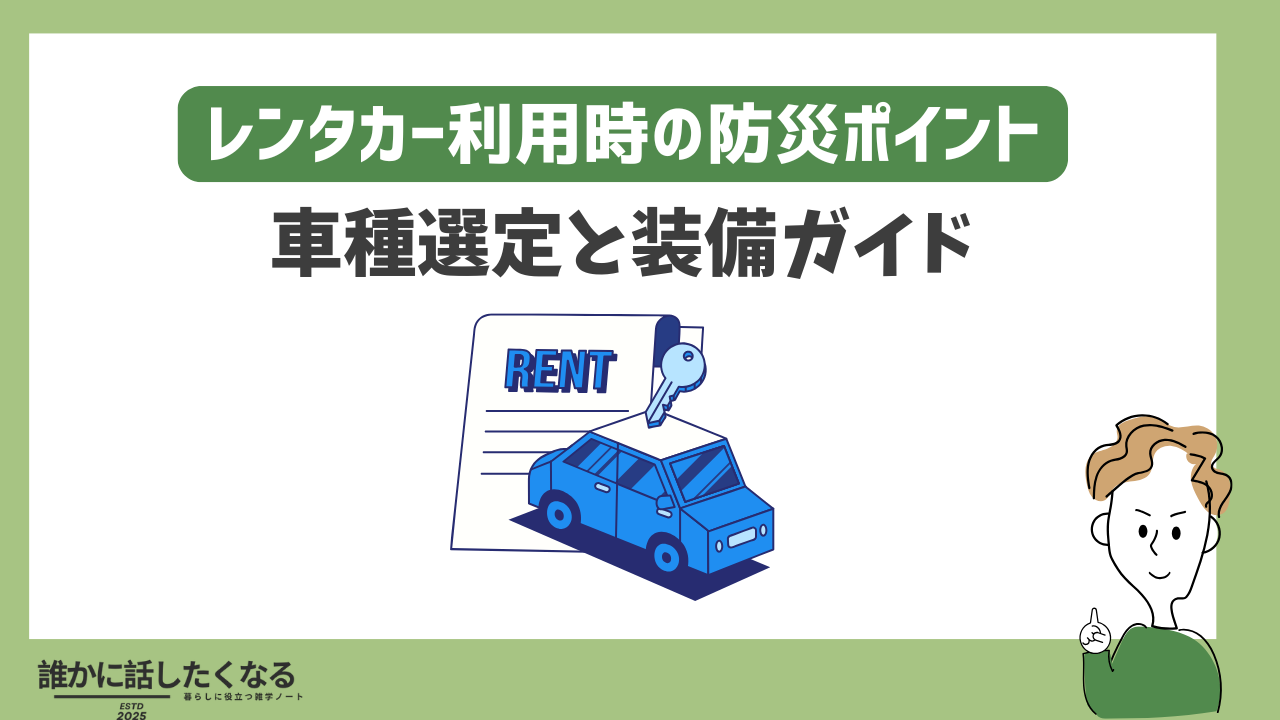 旅や出張でレンタカーを使うとき、車は“移動手段”であり同時に“避難の足場”です。 本稿では、車種選定・装備・運転・ルート・連絡の5軸に、契約・保険の読み合わせと同乗者の役割設計を加えて、災害時に強いレンタカーの借り方と使い方を実務ベースでまとめました。