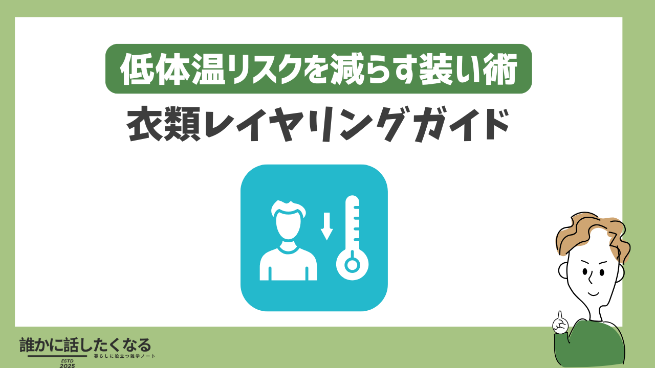冷えの正体は汗と風。ベースで汗を離し、ミッドで空気を抱え、シェルで風雨を遮る。体幹と末端を小物で固め、前を開ける/閉めるで放熱を調整。気温・風・行動量に合わせて一段足す/引くだけで、低体温リスクは確実に減らせます。今日の装いを表とテンプレに沿って見直し、**“寒いを作らない”**一日を。