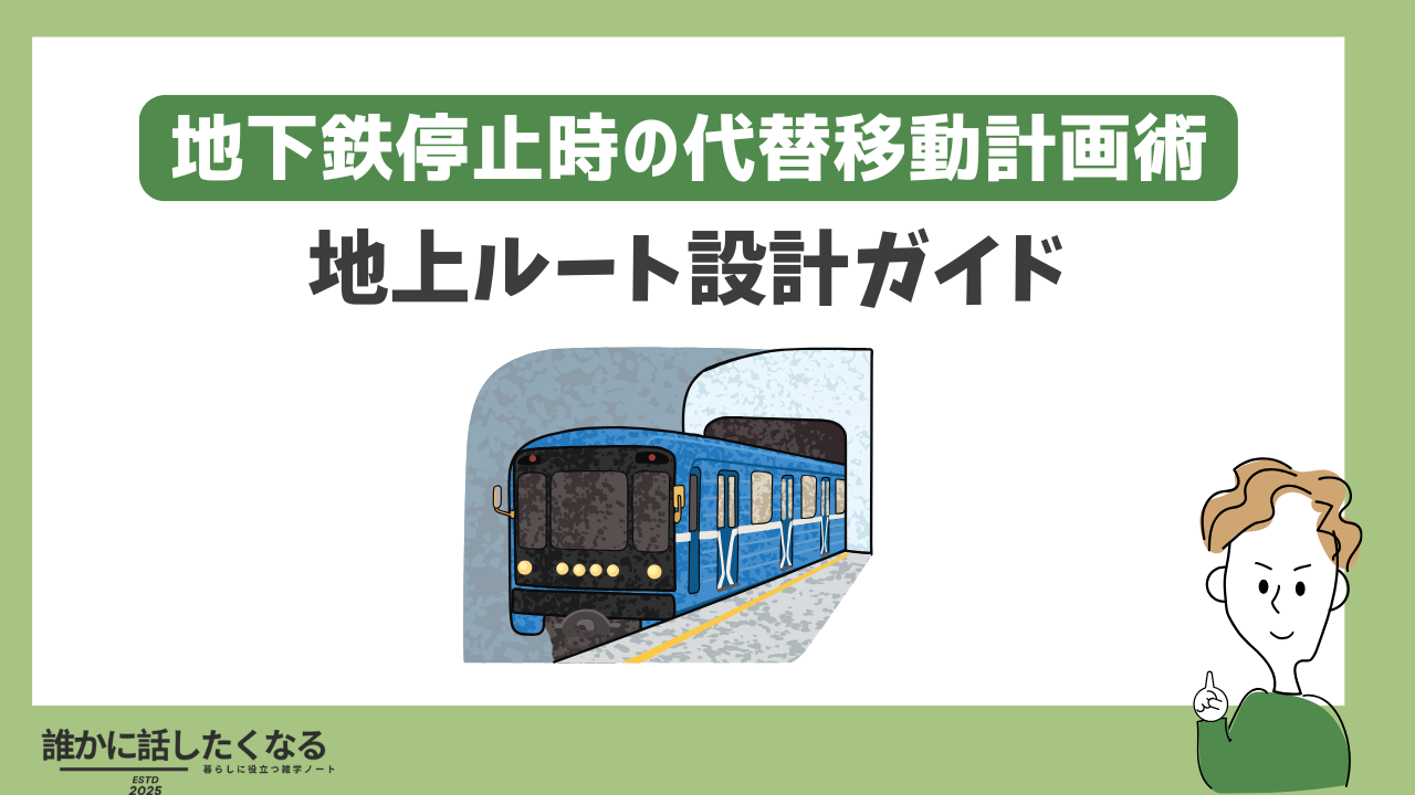本稿は、出発前→駅での初動→地上ルート運用→結節点での乗継→在宅判断の5段で、背骨の道づくり・徒歩/バス/相乗りの切替・混雑/悪天候の安全策・家族/同僚との役割分担までを具体化しました。通勤・通学・受験・出張・通院のいずれでもそのまま使える表とテンプレを多数収録しています。