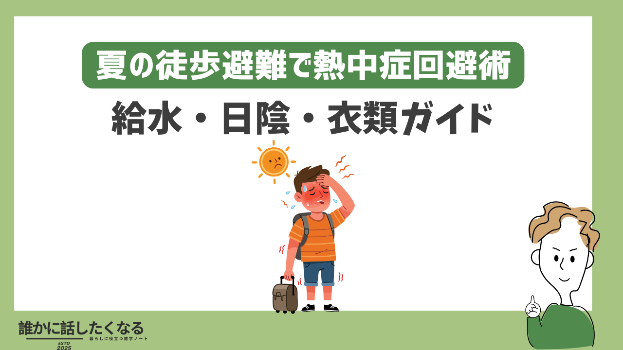 炎天下の徒歩避難は「いつ・どこを・どう歩くか」で安全が大きく変わる。 本稿では、給水・日陰・衣類の三本柱を中心に、歩行ペース、休憩設計、携行品、危険サインの見分けまでを、現場でそのまま使える手順でまとめた。目的は“倒れないこと”ではなく“回復しながら歩き切ること”。