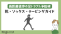薄手〜中厚の速乾ソックスをこまめに交換。綿100%は避ける。 靴はつま先に1cm前後の余裕、踵が浮かないものを選ぶ。砂利道は小石の侵入に注意し、靴ひもは最上段で固定。足のつりには水+塩+歩幅縮小が有効。