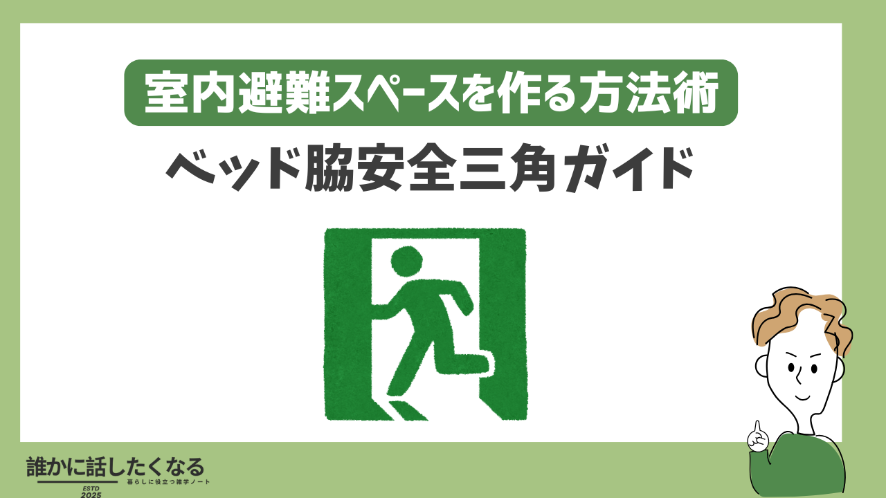 「倒れてこない・落ちてこない・抜け出せる」——この三条件を満たす室内避難スペースを、寝室のベッド脇に確保しておくと、夜間の揺れや突発アクシデントでも最初の10秒を生き抜く力になる。