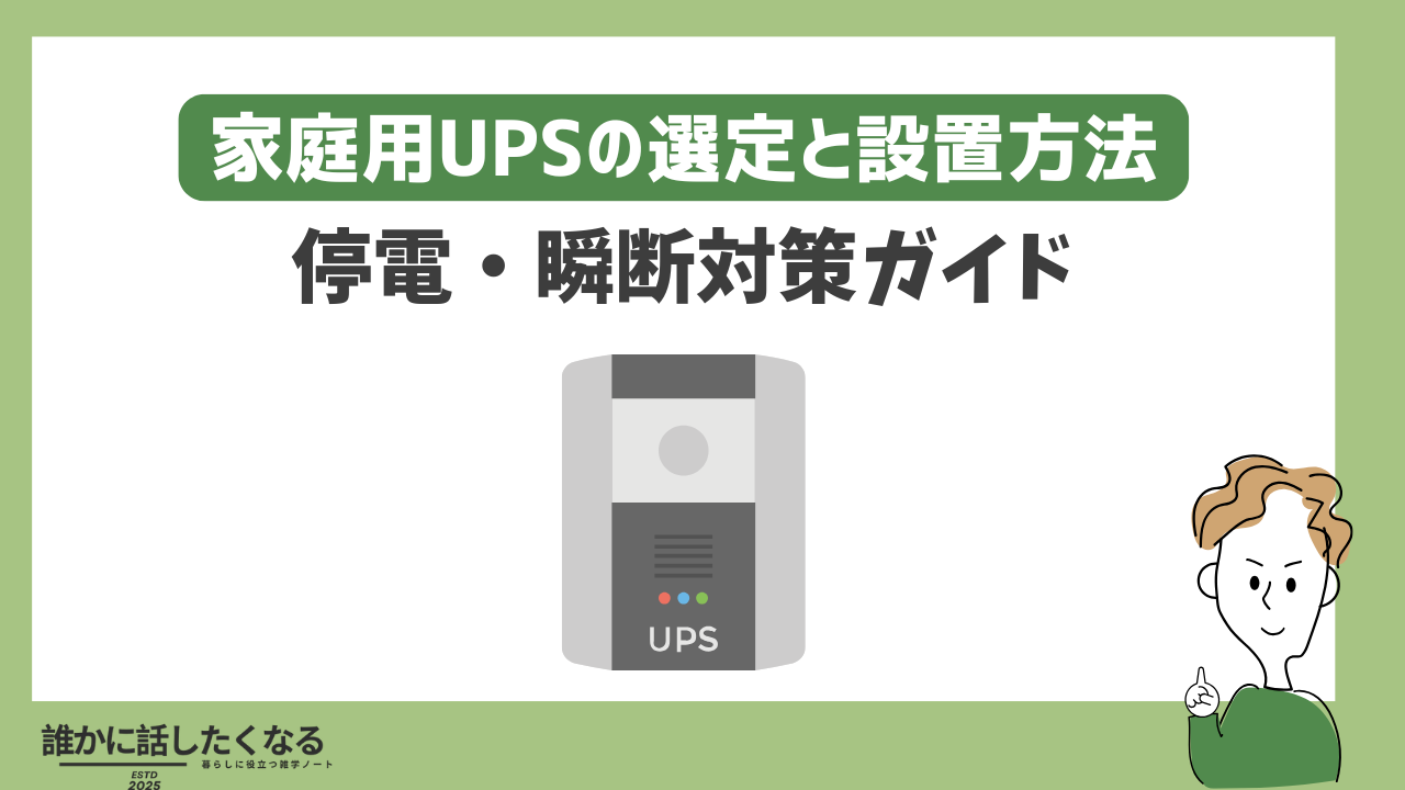 停電は“電気の地震”。 わずか1秒の瞬断でも、PCの作業中断・Wi‑Fi切断・見守り機器の停止が起き、データ損失や安全低下につながります。本稿は、家庭向けUPS(無停電電源装置)を正しく選び、賢く設置し、長く使うための実務ガイドです。方式の違い→容量の計算→設置と配線→運用と保守→家庭シーン別の構成まで表・チェックリスト・早見表を添えて詳説します。