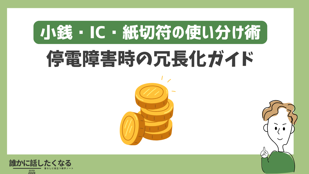 キャッシュレス時代でも、交通機関の障害や停電はゼロにならない。 だからこそ、小銭・ICカード・紙切符の3系統を重ねて持つ“冗長化”が、移動の確実性を引き上げる。