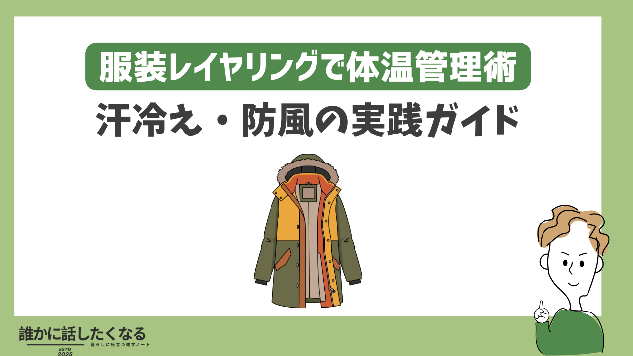 本稿は、肌着→中間着→外着の役割から、天候別・活動別の組み合わせ、脱ぎ着のタイミング、洗濯と乾かし方、非常時の代用品、家族別の工夫まで、家庭で今すぐ使える“実務ガイド”としてまとめました。キーワードは「汗をためない/風を入れない/湿気を逃がす」**の三本柱です。