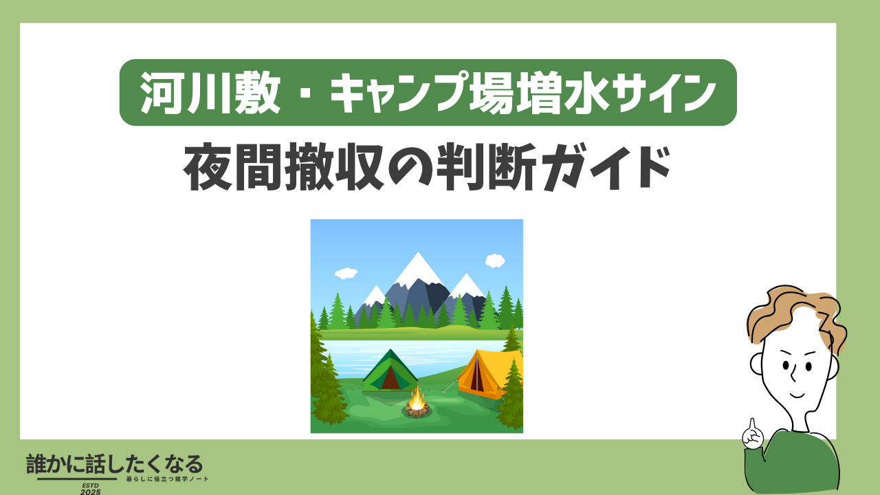 河川敷や川沿いのキャンプ場は、わずかな降雨量や上流の放流で一気に水位が変わる場所です。明るいうちに読めるサイン、暗くなってからの微細な変化、撤収を迷わないための時間軸・行動基準・持ち物を、本稿では表とチェックリストで徹底的に具体化しました。