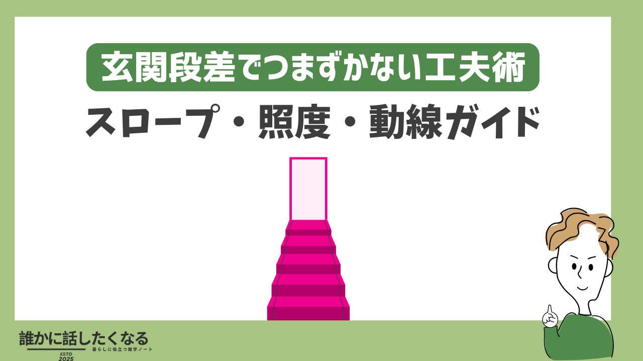 玄関の安全は、緩勾配スロープで段差を消し、足元を均一に照らし、通路から物を外すことで決まる。今日やる三手は、勾配の計算→仮置きで長さ確認、段鼻ラインで一歩目を強調、足元灯を自動点灯。**“見える・滑らない・ぶつからない”**を満たせば、玄関のつまずきは着実に減る。