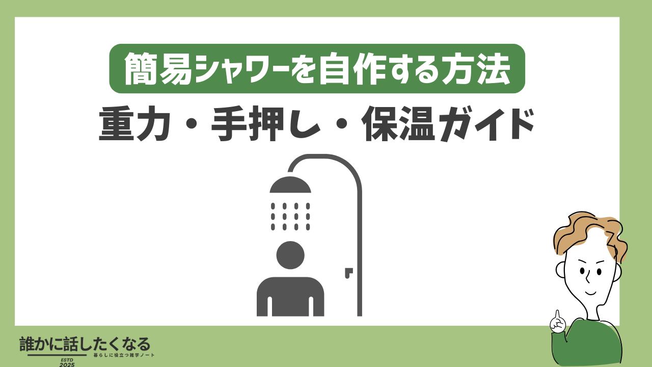 屋外や車中泊、非常時でも“気持ちよく洗える”ことは、体調・衛生・睡眠の質に直結する。市販のポータブルシャワーが無くても、重力式・手押し式・簡易加圧式を正しく設計すれば、限られた水でも泡切れが良く、温かく、片付けが早いシャワー環境をつくれる。