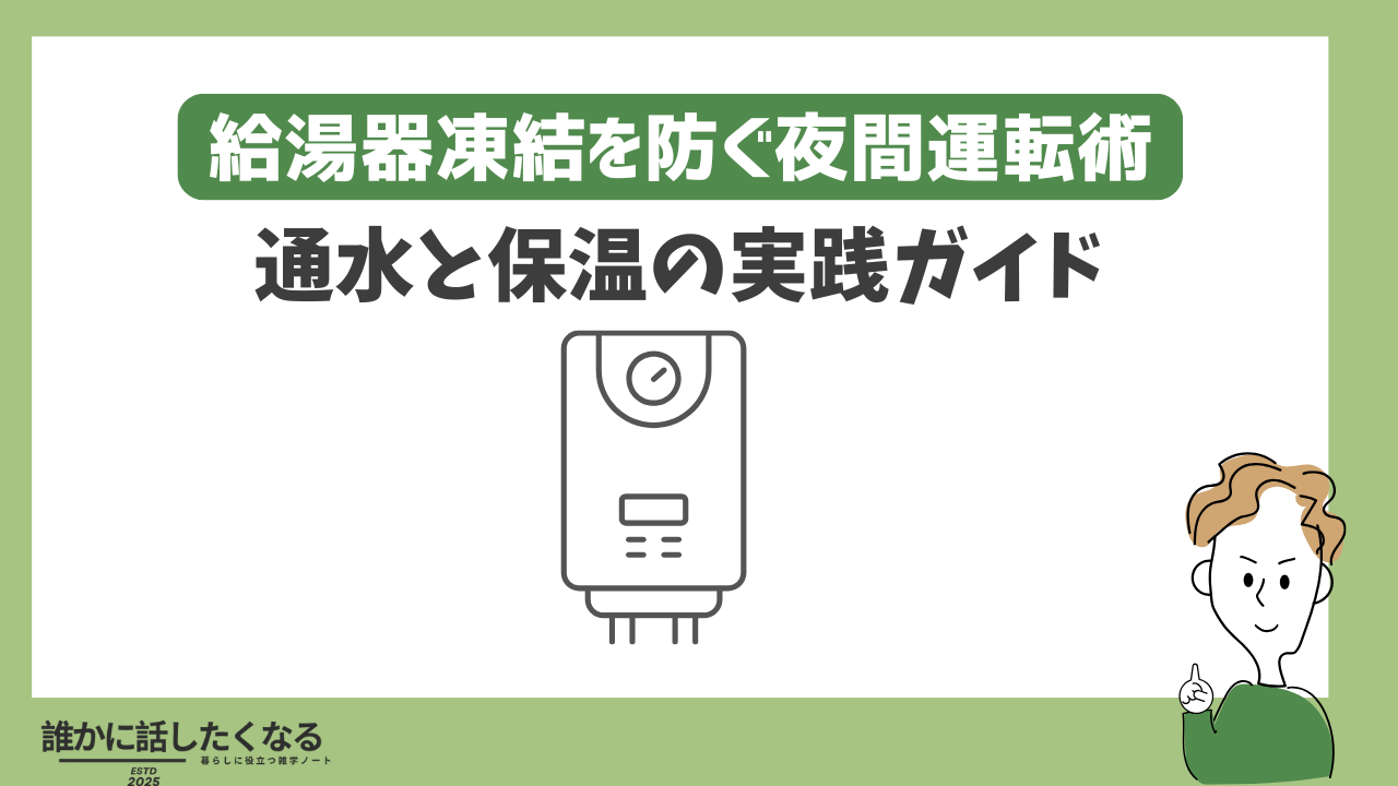 まとめとして、給湯器の凍結は**“水を止めない”“風を当てない”“熱を逃がさない”の三原則で大きく減らせる。未明の冷え込みを想定して細流通水を設定し、保温材と風よけで熱の逃げ道を塞ぎ、就寝前の軽い予熱で配管全体の温度を底上げする。この三段構えを今夜から習慣化すれば、厳寒の夜でも朝いちから蛇口が素直に動く暮らし**を守れる。