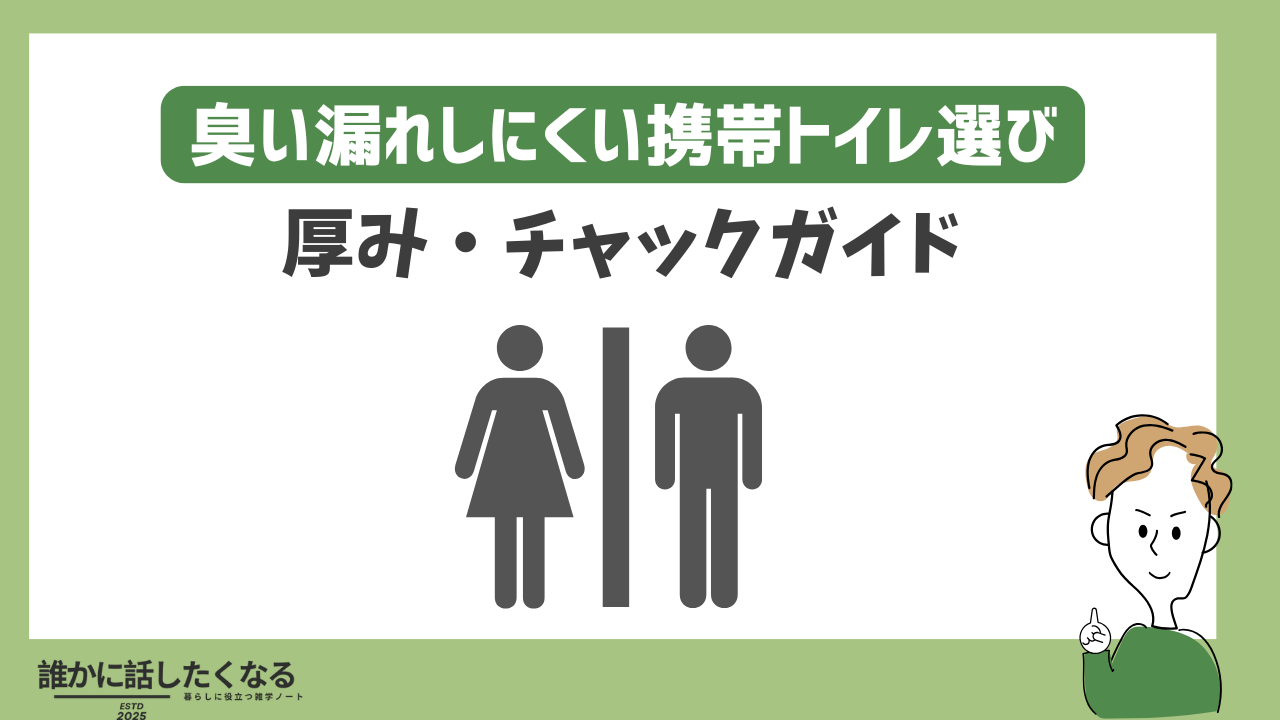 袋の厚み(0.05mm以上)を土台に、チャック+結び/テープで二重封緘、無香の中和・吸着でにおいそのものを断つ。さらに外袋・密閉箱・家族ルールを揃えれば、携帯トイレは家・車・外出のどこでも静かに確実に運用できます。今日、1袋で水テスト→二重封緘→外袋を体験し、手順書をA4一枚にして定位置へ。次の一回から、においの不安はぐっと小さくなります。