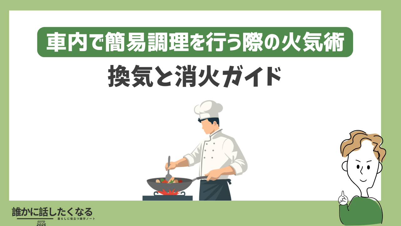車内調理は最終手段であることを忘れず、入口(吸気)・出口(排気)・初期消火の三点を固定化し、不燃化→点火→調理→消火→後処理の一連をチェックリスト運用で標準化する。迷ったらやらない。代替として電気調理・屋外調理・非常食を選び、今日の一食より明日の安全を優先しよう。