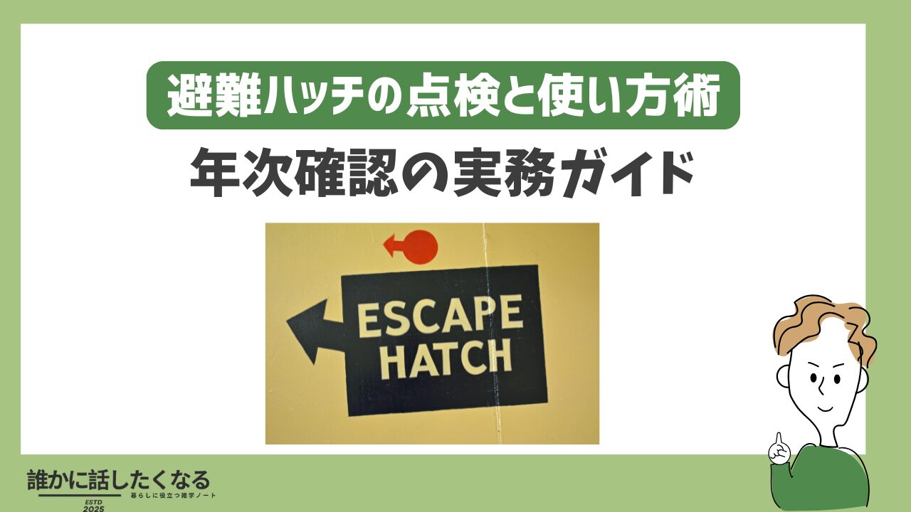 避難ハッチは、使える状態にしておかないと意味がない。年次点検で壊れる前に直し、月次チェックで通行障害をゼロに。家族の合図・役割・持ち物を共有し、夜間・雨天の想定も入れた訓練を回す。今日の10分の点検が、明日の一命を守る。