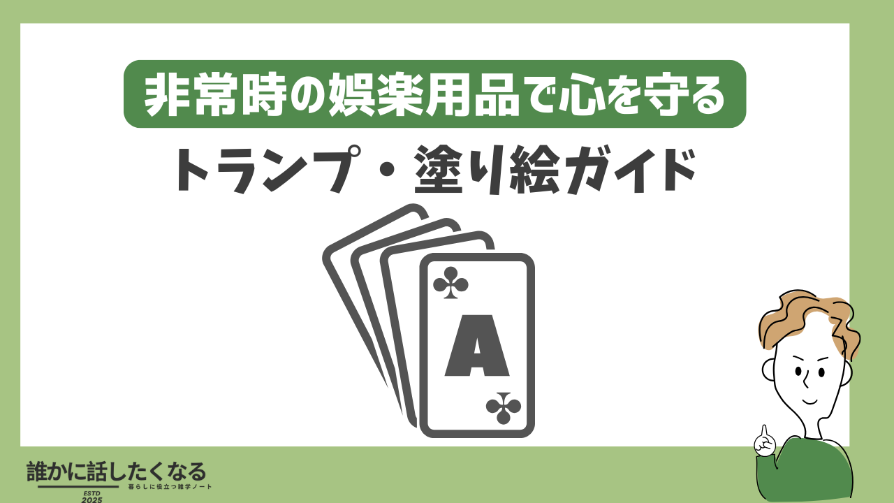トランプ1デッキ・塗り絵・12色――この500gの荷物が、不安の反芻を止め、会話を生み、眠りを助ける音が出ない・短時間・交代制を合言葉に、家用2セット+非常袋1セットを小分けで常備。使う前に手指を拭く→時間で区切る→掲示して称えるの三段で、非常時のこころの体力を守ろう。